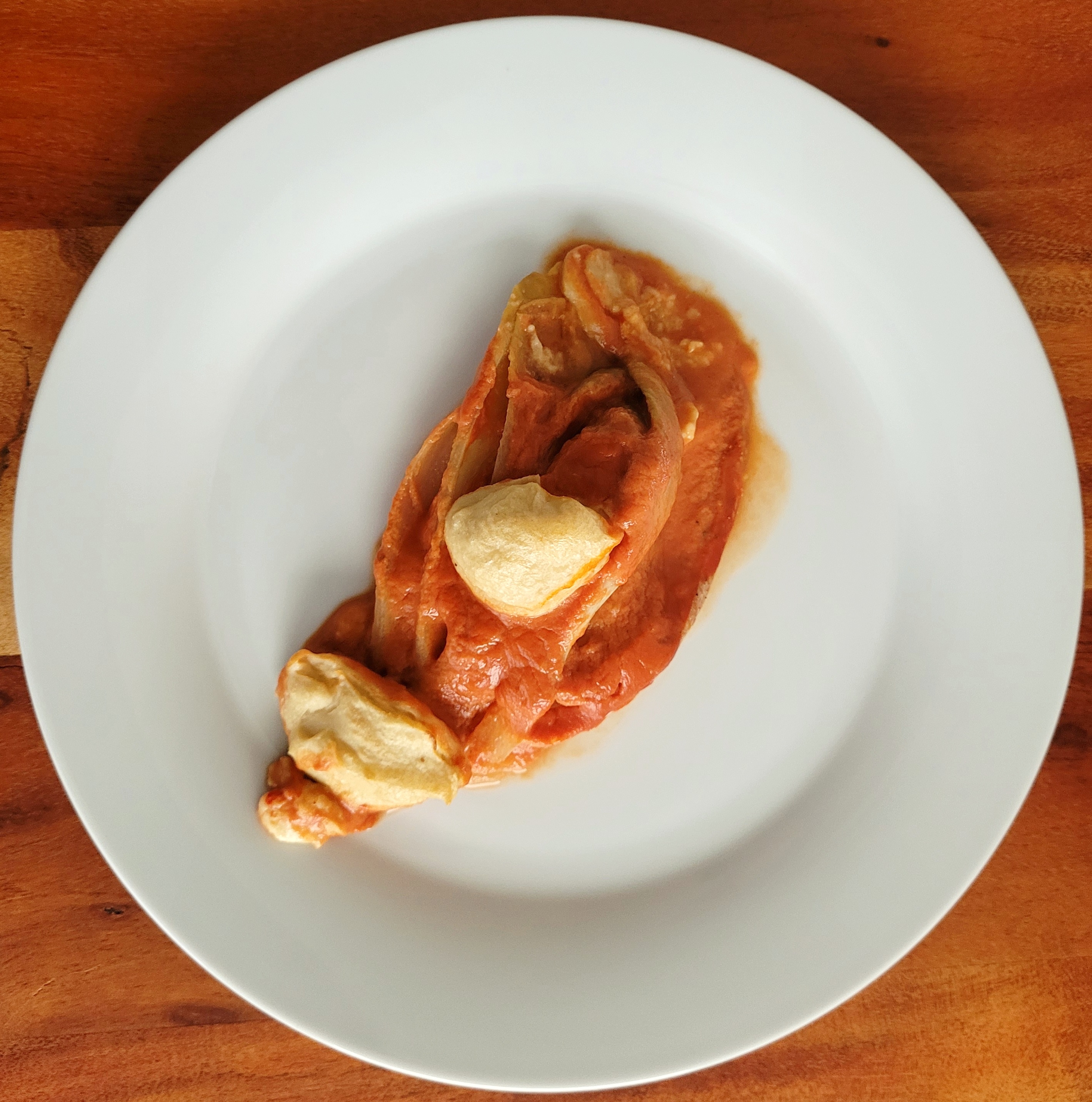 Mit pflanzlichem Mozzarella überbackener Chicorée